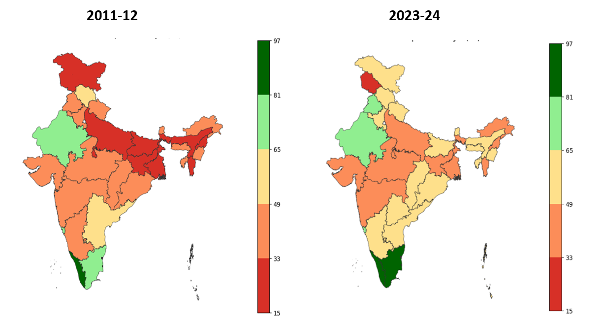 - वर्ष 2011-12 हेतु, हम 2011 की जनगणना के जनसंख्या आँकड़ों का उपयोग करते हैं। वर्ष 2023-24 के लिए, हमने राष्ट्रीय जनसंख्या आयोग (भारत सरकार, 2020) से अनुमानित जनसंख्या पर विचार किया है।