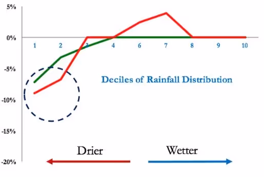 Most models of climate change predict an increase in the variability of rainfall, in particular, an increase in the number of dry days as well as days with extremely high levels of rainfall. Once again, extrapolating from the observed increase in the number of dry days over the past three decades, this channel alone could account for a 1.2% decline in farm incomes.