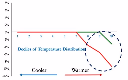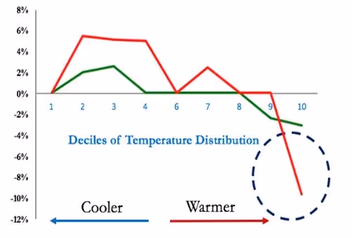 Figure 2. Effects of temperature on yields in irrigated (green) and unirrigated (red) areas