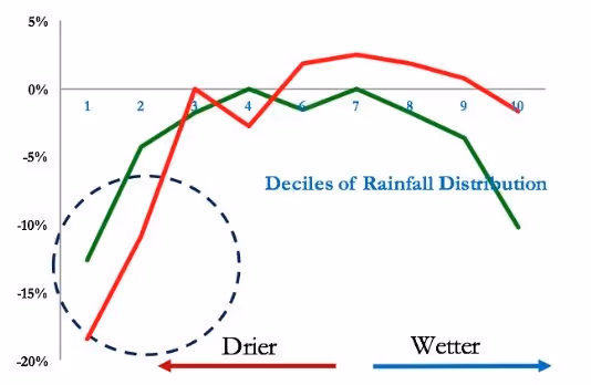 Figure 3. Effects of rainfall on yields in irrigated (green) and unirrigated (red) areas