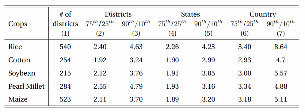 Note: The table reports the mean value for the ratio of the 75th to 25th percentile potential yields in columns 2, 4 and 6 (across districts, states and at country-level respectively); and the ratio of the 90th to 10th percentile potential yields in columns 3, 5 and 7.