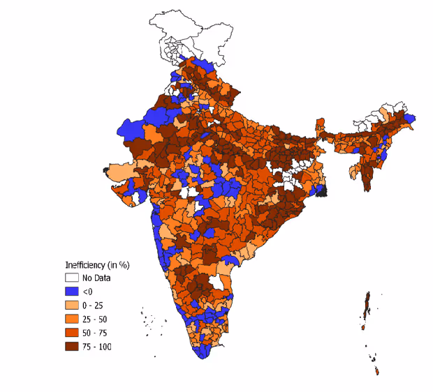We find that up to 25.2 million hectares (or 39%) of agricultural land can potentially be released across all districts in India if the planner optimises district-by-district. Figure 1 plots the inefficiency index for each district. If we sum up the actual and optimal areas at the state level and recalculate inefficiency, the state of Kerala turns out to be the most efficient; while the least efficient is Mizoram, followed by Himachal Pradesh.