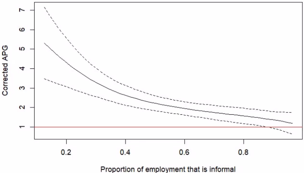 The estimated function is downward sloping – the APG declines as the proportion of informal employment increases. The null hypothesis of perfect mobility between agriculture and the non-farm sectors is rejected whenever the percentage of informal employment is less than 83%. On the other hand, the hypothesis is not rejected for sectors where the proportion of employment that is informal is greater than 83%. Depending on the year, these sub-sectors account for 40-50% of all non-farm employment.