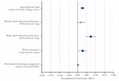 Note: The figure shows regression discontinuity results for key agricultural outcomes. Blue points indicate normalised treatment effects that are statistically different from 0, and grey dots indicate insignificant results.