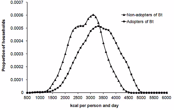 The data show that Bt adopting households consume significantly more calories than non-adopting households, and a smaller proportion of them is food insecure. Being food insecure is defined as consumption below the safe minimum daily intake of 2,300 kilocalories (kcal) per person (Figure 1).