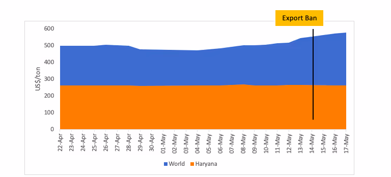 The ban on wheat exports led to depressed domestic wheat prices. For instance, Figure 3 shows that from 22 April to 12 May, that is, before the ban, prices in the international market were, on average, US$ 498 per tonne, as compared to domestic market price (for instance, in the state of Haryana) averaging US$ 263 per tonne. After the imposition of the ban on exports from India, international prices began rising significantly, to US$ 545, US$ 570, and US$ 576 per tonne, well over the pre-export ban price of US$ 518 per tonne on 12 May, and are continuing to rise.