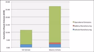 They show that manufacturing an EV results in higher emissions relative to an ICE vehicle, primarily due to the materials and fabrication of the Li-ion battery used in an EV. Thus, producing a mid-sized EV result in up to 1.6 times the emissions compared to a similar sized ICE vehicle. The industry is endeavouring to reduce the manufacturing emissions for EVs in the following ways:
