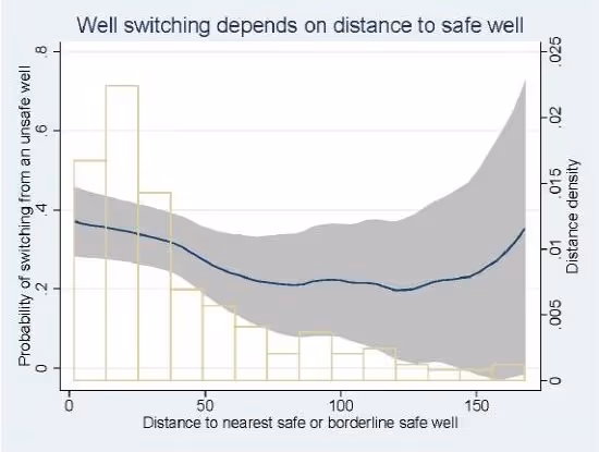 Note: The graph shows the probability that household whose wells tested ‘red’ (high arsenic) in 2012 switched to a safer (‘blue’ or ‘green’) well, conditional on distance (in metres) to the nearest safer well.