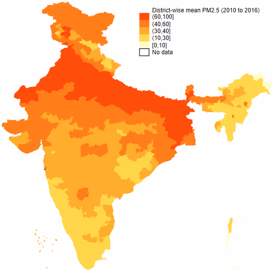 Figure 1. Mean pollution (PM2.5) in India across districts of India: 2010-2016