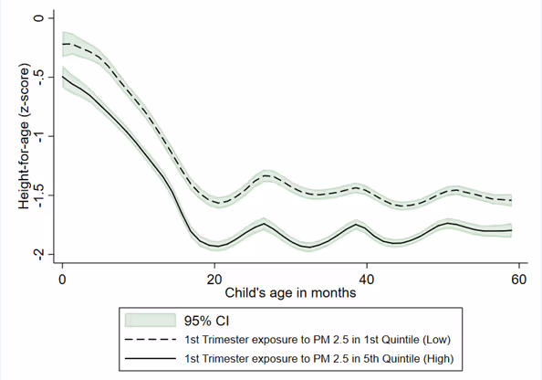 नोट: प्रदूषण के निम्न स्तर के संपर्क (पहला पंचमक) में रहने वाले बच्चे बनाम वे लोग जो अपने पहले तिमाही के दौरान प्रदूषण के उच्च स्तर (पांचवां पंचमक) के संपर्क में थे, महीनों में उम्र के अनुसार कद और बच्चे की उम्र के बीच बहुपद फिट प्लॉट। छायांकित क्षेत्र 95% विश्वास अंतराल2 है।