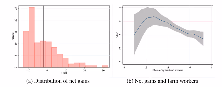 These are aggregate estimates and mask the distributional aspect of these losses. Figure 5(a), which presents the distribution of net gains per capita, shows that some districts also experienced net losses. Positive net gains were primarily experienced in the surplus grain-producing states of Punjab and Haryana but at the cost of rest of the region. Finally, Figure 5(b) shows a negative association between the proportion of farm workers and net gains, implying that regions with greater employment in agriculture also experienced net losses.
