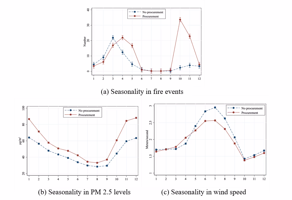 Figure 2 shows the seasonality in fire events, PM 2.5 levels, and wind speed. Fire activity seasonally peaks in the winter months of October and November (panel (a)). The increase in winter fire activity is matched by an increase in PM 2.5 levels during these months (panel (b)). The important thing to note is that the increase in fire activity and PM 2.5 levels observed during winter months is higher for districts with foodgrain procurement and overlaps with the rice harvesting season. Weather conditions also support the fire-air pollution link, as average wind speeds are the lowest in winter months (panel (c)). This, combined with low rainfall at this time, implies that pollutants from fires remain suspended in the atmosphere for longer durations. Based on the observed seasonal patterns and the rice harvest window, my research ((Negi 2024) focuses on total fire events and PM 2.5 levels for the winter months of October, November, and December.