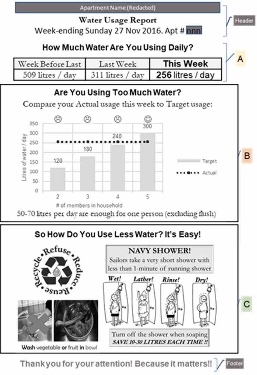 हम लक्ष्य-निष्पादन के सुस्थापित सिद्धांत (लोके और लैथम 2006) को हस्तक्षेप के एक तंत्र के रूप में अपनाते हैं- लक्ष्य तब क्रियाओं में तब्दील हो जाते हैं जब लक्ष्य विशिष्ट, व्यवहार्य होते हुए भी कठिन होते हैं, और व्यक्ति के पास अपने लक्ष्य की ओर कार्य करने के लिए प्रेरणा और कौशल होता है । हमारा हस्तक्षेप, एक साप्ताहिक जल-उपयोग रिपोर्ट के साथ घर में पानी के उपयोग की सरल जानकारी प्रदान करता है (चित्र 1 में रिपोर्ट का भाग ए), निष्पादन पर प्रतिक्रिया के साथ पानी के उपयोग संबंधी लक्ष्य का सुझाव देता है (चित्र 1 में भाग बी) और इस लक्ष्य को पूरा करने के लिए युक्तियाँ (चित्र 1 में भाग सी) भी प्रदान करता है। चित्र 1 में दिखाए गए ये तीन भाग घरों में पानी के उपयोग से संबंधित आदतों को बदलने में मदद करते हैं। हमारे आदत-परिवर्तन ढांचे के आधार पर यह हस्तक्षेप घर में पानी के उपयोग के बारे में घरेलू-विशिष्ट प्रतिक्रिया के माध्यम से पानी के उपयोग को सीमित करने के बारे में विचारों को प्रेरित कर सकता है। इसके अलावा, आसान उपायों के रूप में सुझाव देकर पानी के उपयोग को कम करने और पानी के उपयोग की दक्षता में सुधार की दिशा में विशिष्ट संरक्षण कार्यों को लागू करना संभव है। हम चित्र 1 में दिखाई गई इस मुद्रित एक-पृष्ठ रिपोर्ट को केवल पाँच सप्ताह के लिए भेजते हैं जिसमें प्रत्येक सप्ताह घर में रसोई और शॉवर में पानी का उपयोग कम करने जैसी नई युक्तियों-सहित पानी के उपयोग को कम करने में स्थानीय रूप से प्रासंगिक चुनौतियों को शामिल किया जाता है।