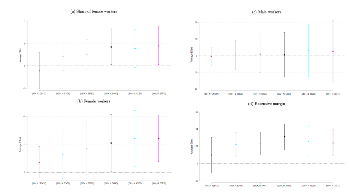 टिप्पणियाँ : (i) ये आँकड़े राज्य-स्तर के बदलावों का असर दर्शाते हैं, जिनसे महिलाओं को नाइट शिफ्ट में काम करने की इजाज़त मिली, और कम्पनियों के नतीजों पर इसका असर दिखा। (ii) महिला श्रमिकों का हिस्सा कम्पनी में महिला श्रमिकों की संख्या को पुरुष और महिला श्रमिकों के जोड़ से भाग देने पर तय होता है (पैनल ए)। (iii) एक्सटेंसिव मार्जिन को एक बाइनरी चर से मापा जाता है, जो तब एक के बराबर होता है जब कम्पनी में कम से कम एक महिला श्रमिक हो और नहीं तो ज़ीरो होता है (पैनल डी)। (iv) आकृति अलग-अलग आकार की कम्पनियों के सन्दर्भ में नाइट शिफ्ट में बदलाव का अनुमानित औसत असर दर्शाता है, जिनमें क्रमशः कम से कम 50, 100, 150, 200, 250, और 300 स्थायी कर्मचारी हैं। (v) अनुमान में कम्पनी और उद्योग वर्ष के नियत असर शामिल हैं। (vi) बार अनुमानों के सन्दर्भ में 95% विश्वास अंतराल दर्शाते हैं। विश्वास अंतराल अनुमानित असर के बारे में अनिश्चितता बताने का एक तरीका है। 95% विश्वास अंतराल का मतलब है कि, अगर आप नए नमूने के साथ प्रयोग को दोहराते हैं, तो 95% बार कैलकुलेटेड विश्वास अंतराल में असली असर होगा।