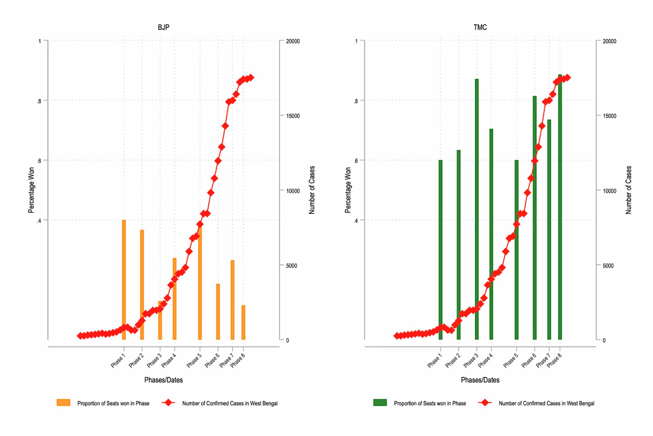 Figure 3. Effect of Covid-19 and vote shares of BJP and TMC, by phases