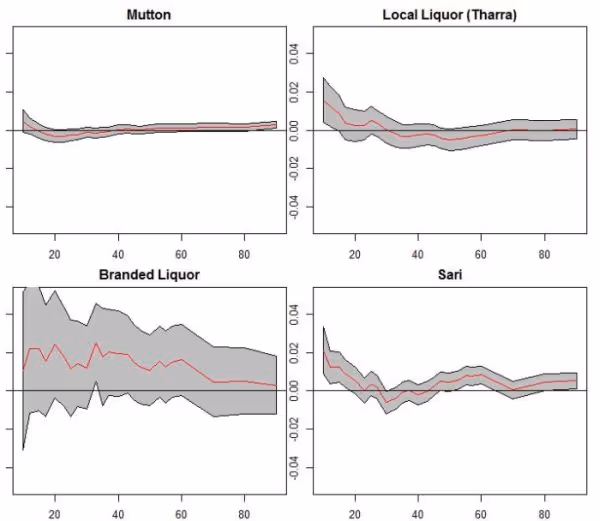 The question is - on what do households spend the windfall gain? We find that households tend to spend more on a range of staples, and, to an extent, on ‘intoxicants’. While our results are strongest for saris and other clothing, we see the pattern in several other items. Figure 1 below shows the spike in consumption for some items just before elections. Notice the contrast between local liquor and branded liquor suggesting that the former responds to election periods while the latter does not.
