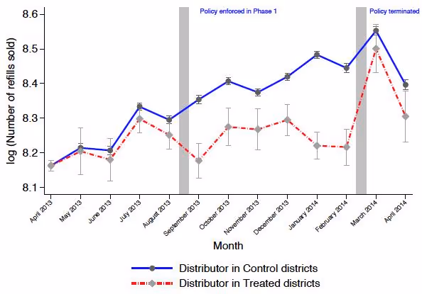 The DBTL policy reduced household LPG purchases by between 11% and 14% (Figure 3). When the DBTL policy was terminated, status quo dual-prices resumed. The results show that, after the policy termination, household fuel purchases in DBTL districts increased quickly.