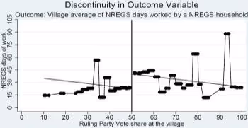 To address the first challenge, we looked at the constituencies where politicians of the ruling party marginally won elections at the village level versus the constituencies where they marginally lost. Since constituencies where the ruling party marginally won elections should be no different than the constituencies where they marginally lost, comparing the constituencies in this way allowed us to see whether MNREGA allocation of funds or its implementation in constituencies where the ruling party marginally won differed significantly from the cases where the ruling party marginally lost constituencies. If we did find that there was a significant difference, we could attribute this to the targeting of the winning constituency by the ruling party. To address the second challenge, we looked at the effect of increased MNREGA funds and implementation that could be reliably attributed to targeting of marginal constituencies by the ruling party on electoral returns of the incumbent party.