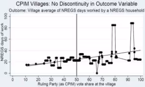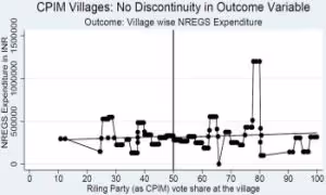 In Figure 1, where we see a sharp jump in MNREGA allocation of funds to constituencies and days worked where the ruling party marginally won at just over 50% of the votes, versus constituencies where they marginally lost to the opponent party. This suggests that the ruling party in West Bengal targeted swing constituencies instead of the constituencies where they had core support (that is, constituencies where they had the majority of votes). However, we find that the targeting of marginal constituencies differed between the two main political parties – while TMC-run GPs targeted marginal constituencies, CPIM-run GPs did not. As is clear from Figure 2, there was a significant difference in MNREGA fund allocation and implementation between the constituencies. TMC marginally won versus the ones they marginally lost. But we find no such difference in MNREGA allocation of funds or implementation between marginal constituencies won by the CPIM and the marginal constituencies that they lost (Figure 3).