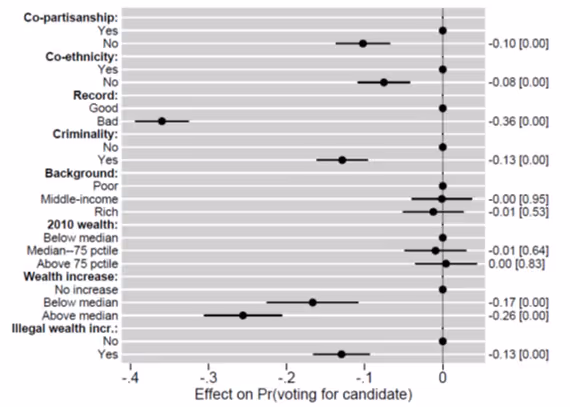 Figure 2. The effect of wealth accumulation and other politician characteristics on citizens’ hypothetical vote choice