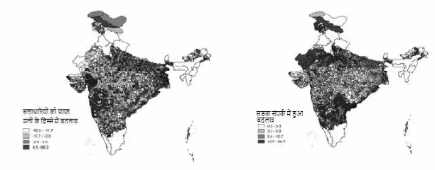 टिप्पणी: दायां पैनल परिसीमन पूर्व की अवधि (1999-2008) में राज्यस्तरीय चुनाव में सत्ताधारी दल के मतों के हिस्से में हुए बदलाव को दर्शाता है जिसे किसी खास निर्वाचन क्षेत्र के लिए लगातार दो चुनावों में सत्ताधारी दल के मतों के हिस्से में प्रतिशत अंतर के रूप में मापा गया है। बायां पैनल उन्हीं चुनावों की अवधि में सड़क संपर्क में हुए बदलाव को दर्शाया गया है जिसे निर्वाचन क्षेत्र में सड़क से जुड़े गांवों के प्रतिशत के रूप में मापा गया है।