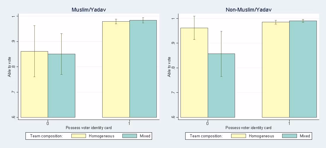 In addition, based on respondents’ self-reported experiences, Figure 2 plots the probability of being allowed to vote for each of four elector categories (Muslim/Yadav or not; possess EPIC or not), separately by whether they interacted with a homogeneous versus mixed team at their polling station. I find that non-Muslim, non-Yadav electors have significantly higher probabilities of being allowed to vote at polling stations with all non-Muslim, non-Yadav officer team members, while no such effects are observed for Muslim and Yadav electors. These differences by officer team composition and potential voter religious/caste-type are absent, however, when individuals possess an EPIC, consistent with the earlier findings based on administrative data. Together, these results suggest that the impacts of team composition on voting outcomes are driven at least in part by own-group favouritism of election officers during the voter identity verification process.