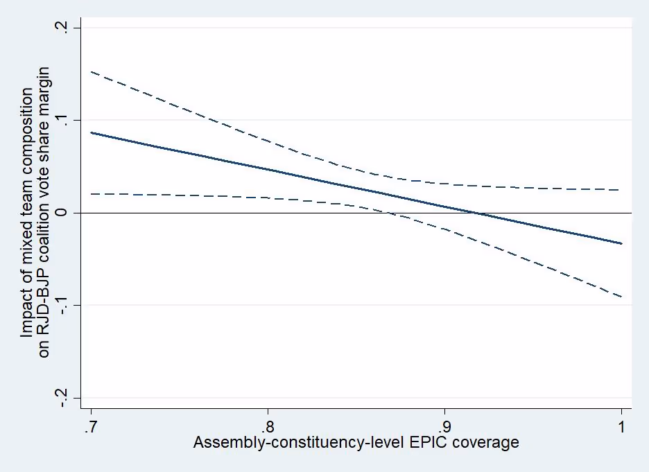 Analysing voting outcomes in Bihar across polling stations with different team types, I find that the presence of a Muslim or Yadav officer on a polling station team (‘mixed team’), versus having a team with no Muslim or Yadav officers (‘homogeneous team’), significantly shifts the vote share margin, on average, between the Rashtriya Janata Dal (RJD) and Bharatiya Janata Party (BJP) coalitions in favour of the RJD by 2.5 percentage points or 13.8%.2 Underlying the vote share impact, I also observe that mixed teams increased the votes received for the RJD by 4.9% and decreased votes for the BJP by 4.2%. Votes received by the Janata Dal (United) (JD(U)) and overall turnout were unaffected.