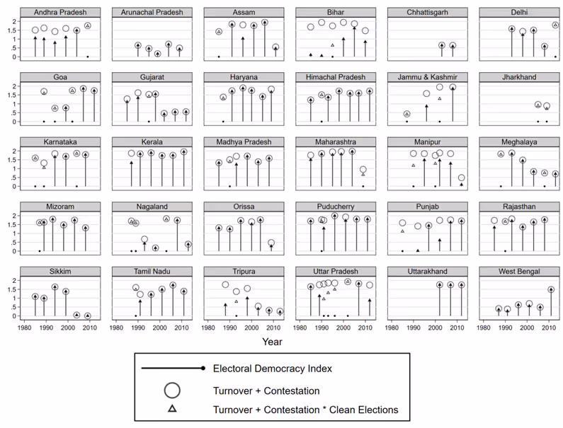 Empirically, our analysis covers roughly three decades. We score the degree of electoral democracy for 28 states and the union territories of Delhi and Puducherry for each electoral period between 1985 and 2013. The indicators in our dataset are available for 171 elections.1