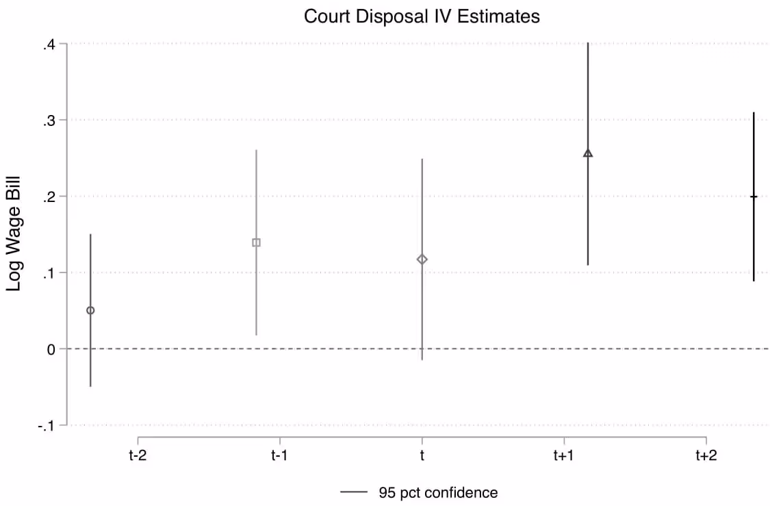 Note: The x-axis presents the time horizon. This shows that an improvement in court disposal rate in a given year (t) affects the outcomes one-two years later. All outcome measures have been transformed so that the estimates can be interpreted in terms of percentage changes when disposal rate increases by 1%. The error bars around the estimates represent a 95% confidence interval, that is, there is a 95% probability that this estimate lies within this range.