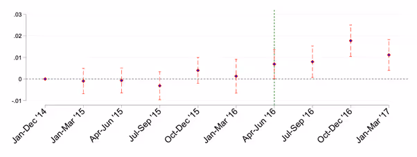 Notes: (i) The figure plots the quarterly coefficients showing the impact on postings for India-based positions based on firms’ exposure to the shock (share of US based vacancies of all firm vacancies before June 2016). (ii) The vertical line corresponds to Trump’s win in the Republican primary in June 2016.