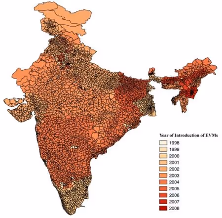 Note: The years of the introduction of Electronic Voting Machines are obtained from Election Commission's orders, and newspaper archives.