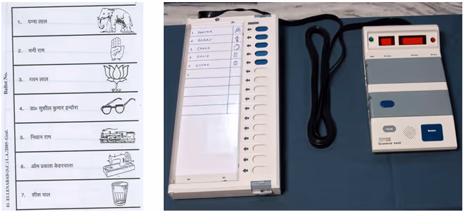 आकृति 1. भारत में प्रयुक्त कागज के मतपत्र और इलेक्ट्रॉनिक वोटिंग मशीनें