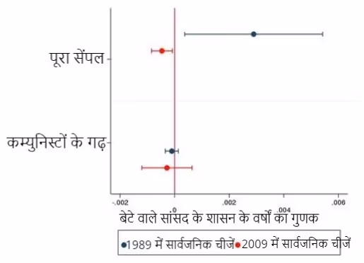 तीसरे, हमने वंशवादी राजनीति के वातावरण के समग्र प्रभाव का आकलन किया है जो संस्थापक के प्रभावों और वंशज के प्रभावों का संयुक्त परिणाम होता है। हमारी अनुभवसिद्ध रणनीति में ऐसी दुनिया से शुरू करके जिसमें घराने संभव नहीं हों, घरानों की मौजूदगी वाली दुनिया तक जाने के लिए आदर्श प्रयोग को सिमुलेट करने का प्रयास किया गया है। चूंकि बेटों वाले राजनेताओं द्वारा अपना घराना स्थापित करने की अधिक संभावना होती है और बेटे आम तौर पर माता-पिता के निर्वाचन क्षेत्रों से ही लड़ते हैं इसलिए जिन स्थानों के पूर्व पदधारियों का कोई बेटा होता है, वे संस्थापकों और वंशजों, दोनों से अवगत रहते हैं। इस वैरिएशन का उपयोग करके हम पाते हैं कि वंशवादी शासन के कुल मिलाकर नकारात्मक आर्थिक प्रभाव होते हैं और उसके चलते स्पष्ट रूप से ‘भाग्य के उलटाव’ वाला विकास पैटर्न स्थापित होता है। बेटे वाले सांसदों के एक्सपोजर का आरंभ में विकास पर सकारात्मक प्रभाव पड़ता है जब राजनेताओं की पहली पीढ़ी सत्ता में होती है और वह वसीयत संबंधी चिंता से प्रेरित होती है। लेकिन जब राजनेताओं की दूसरी पीढ़ी राजनीति में आती है और अपने माता-पिता के निर्वाचन क्षेत्र की विरासत को अपनाती है, तो बेटे वाले सांसदों के अधिक आरंभिक एक्सपोजर वाले ये स्थान पिछड़ जाते हैं और हमारी सेंपल अवधि के अंत तक वे अधिक गरीब हो जाते हैं और उनके पास कम सार्वजनिक चीजें होती हैं। समय में बदलाव वाले ये पैटर्न किसी घराने के जीवनचक्र के साथ संगतिपूर्ण होते हैं, लेकिन सर्वाधिक स्पष्ट रूप से भ्रामक व्याख्याओं के साथ (जैसे कि बेटे की पसंद) संगतिपूर्ण नहीं होते हैं। साथ ही, आरंभिक सकारात्मक प्रभाव और बाद में होने वाला नकारात्मक प्रभाव, दोनो ही कम्युनिस्ट पार्टी जैसे घरानों के विरोधी मानकों वाले दलों के मजबूत प्रभाव वाले क्षेत्रों में अनुपस्थित होते हैं। कुल मिलाकर किसी वंशवादी शासन के एक्सपोजर में एक मानक विचलन वृद्धि होने से किसी गांव के धन शतमक (परसेंटाइल) दर्जे में 7 प्रतिशत अंकों की कमी आती है।