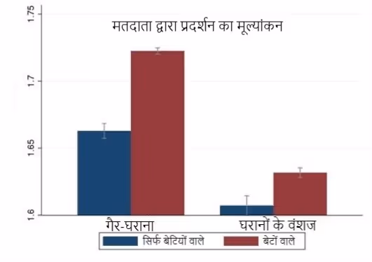 दूसरे, हमने दर्शाया कि वसीयत की नीयत राजनेताओं को अपने काम में बेहतर प्रदर्शन करने के लिए प्रोत्साहित करती है। इसकी जांच के लिए कि वसीयत की नीयत कार्यगत व्यवहार को प्रभावित करता है या नहीं, हमने राजनेताओं की समय सीमाओं पर हुए शॉक की पहचान की है। भारत में राजनीति में प्रवेश के लिए महिलाओं को काफी बाधाओं का सामना करना पड़ता है। बच्चों की संख्या के आधार पर बेटा वाले राजनेताओं के लिए एकमात्र बेटी वाले राजनेता की तुलना में घराना बनाने की दोगुनी संभावना होती है जबकि उनकी अधिकांश जनसांख्यिक और राजनीतिक विशेषताएं एक जैसी दिखती हैं। अपने कार्यकाल में बेटा वाले राजनेता अधिक मेहनत करते हैं। एक ही क्रियान्वयन एजेंसी होने पर भी उनके द्वारा स्थानीय विकास परियोजनाएं पूरी कराने की संभावना दो प्रतिशत अंक अधिक होती है। निर्वाचन क्षेत्र में विकास कार्य का जायजा लेने के लिए उनके द्वारा स्थानीय प्रशासकों के साथ तय त्रैमासिक बैठकें करने की संभावना छः प्रतिशत अंक अधिक होती है। और मतदाताओं द्वारा उनके प्रदर्शन का बेहतर मूल्यांकन भी किया जाता है।