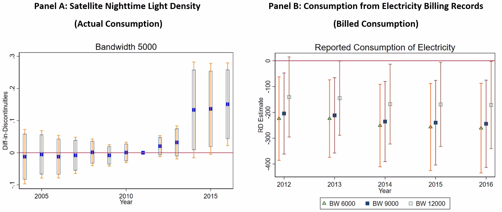 Notes: (i) Panel A shows the effect of being represented by an elected official from the ruling party in the state, on actual consumption, measured by satellite nighttime lights data. Before the election year, 2011, there was no discontinuity in electricity consumption, but after 2011, there is a marked increase in consumption in constituencies aligned with the ruling party.