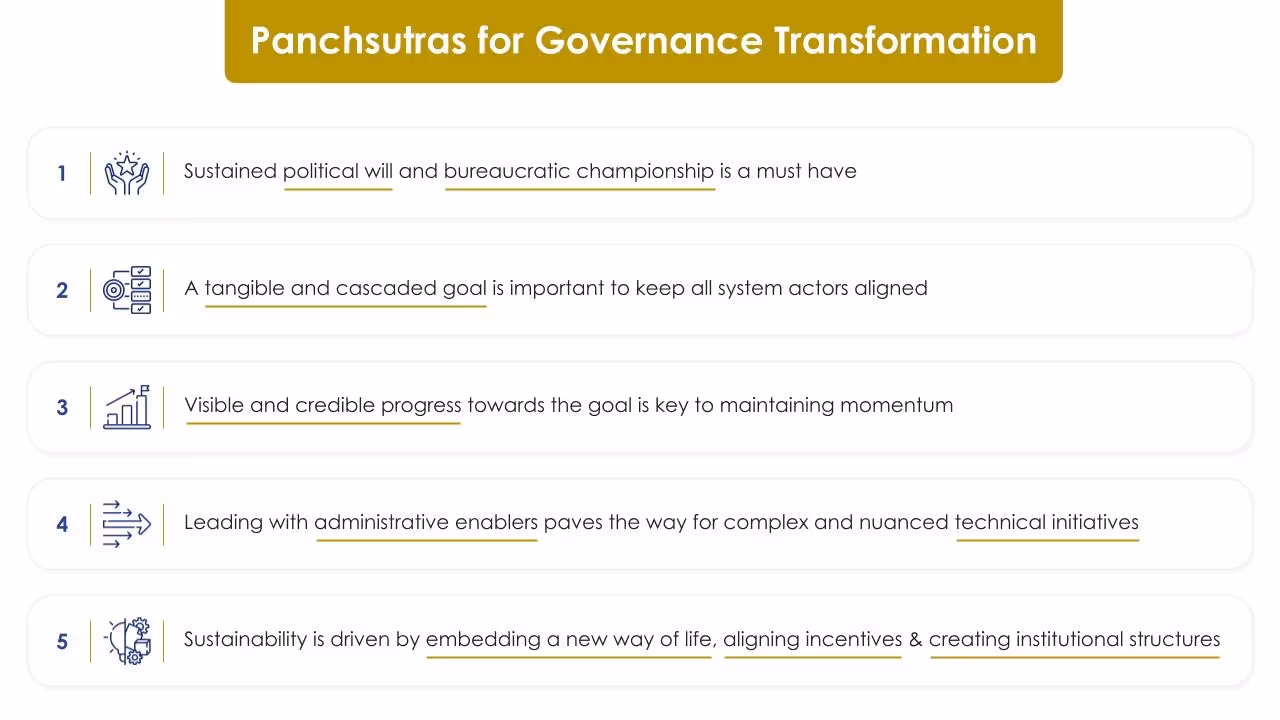 Overall, even if one of the five panchsutras is missing, it puts the success of the governance transformation at risk. These panchsutras can be useful for practitioners in, or engaging with, government to design and implement transformation programmes more deliberately such that they have the maximum chance of achieving their objective.