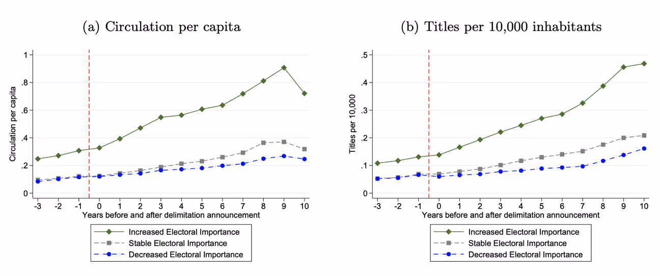 भारत में अत्यधिक राजनीतिकरण वाले समाचार पत्र मीडिया बाज़ार के गुणात्मक साक्ष्य के अनुरूप, हम उन क्षेत्रों में समाचार पत्रों की आपूर्ति में पर्याप्त वृद्धि पाते हैं, जिन्हें परिसीमन के कारण चुनावी महत्त्व प्राप्त हुआ। हम उन बाज़ारों में समाचार पत्रों की संख्या और समाचार पत्र के प्रसार, दोनों में वृद्धि को दर्ज करते हैं जिनका चुनावी महत्त्व होता है। यह वृद्धि लगभग तत्काल है, भले ही अधिकांश स्थानों पर चुनाव अभी भी कई साल के बाद होने वाले थे और यह वृद्धि परिसीमन की घोषणा के बाद दस साल की अवधि में भी जारी है।