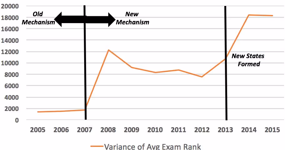 Figure 2. Variance of within-cadre average exam rank across all cadres