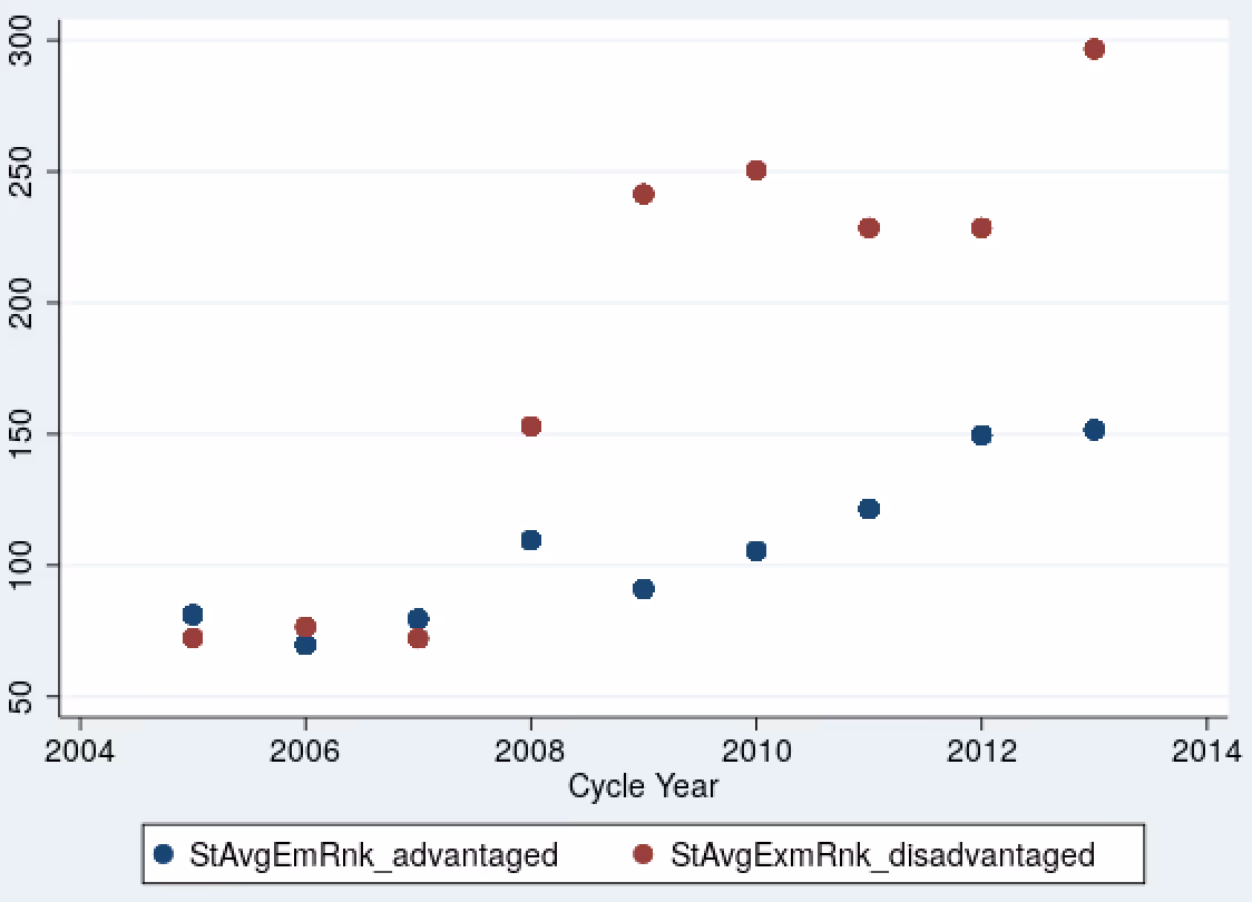Figure 1. Average of within-cadre average exam rank for advantaged cadres (blue) and disadvantaged cadres (red) over time