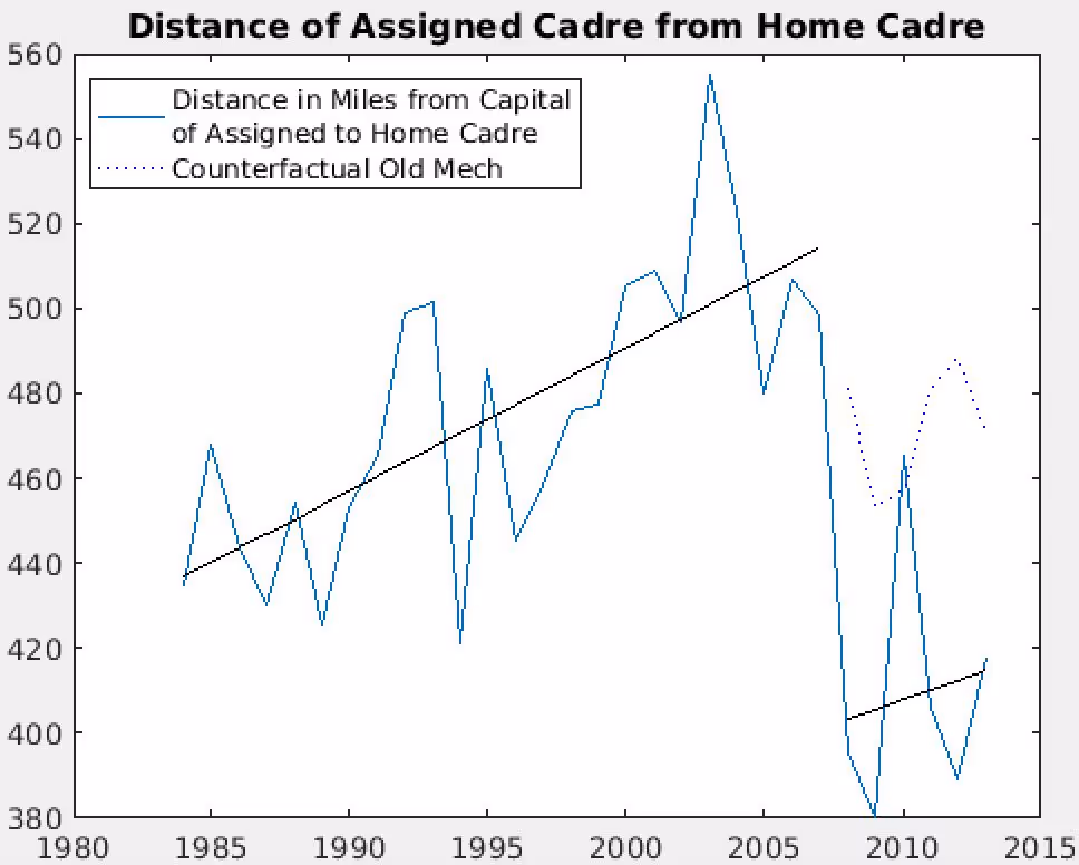 Moreover, as a result of the 2008 Policy, distance of assigned cadre from home cadre decreases and homophily increases with Northerners staying in Northern cadres and Southerners staying in Southern cadres. This undermines the national unity and integration purpose of the All-India Services.