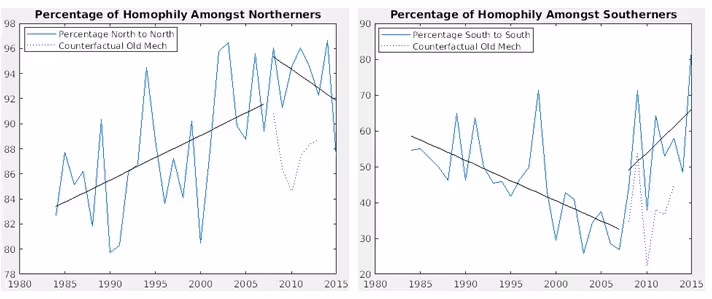 Note: Notice upswing in homophily after 2008 Policy, especially when compared to 1984 Policy run on post-2008 data (dotted line).