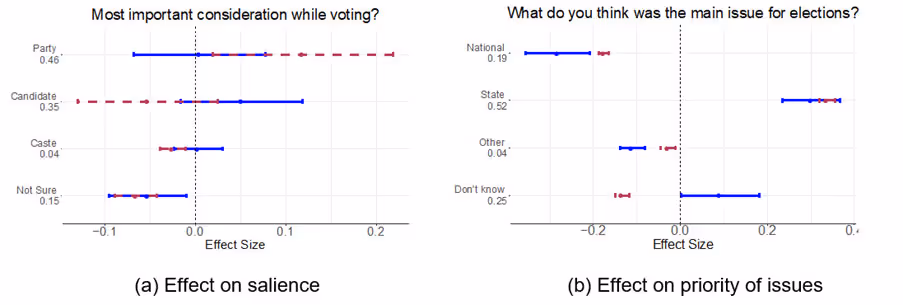 आकृति 2 में पैनल (ए) इस प्रश्न के लिए परिणाम दिखाता है। हम पाते हैं कि एक साथ कराए गए चुनावों के बाद 'पार्टी' कहने वाले उत्तरदाता 12 प्रतिशत अंक अधिक थे (अलग-अलग समय पर कराए गए राज्य चुनावों की तुलना में)5। यह देखते हुए यह एक बड़ा प्रभाव है कि पूरे प्रतिदर्श में औसतन 46% उत्तरदाताओं ने 'पार्टी' का उल्लेख किया है। इससे पता चलता है कि हमारे उपरोक्त तर्क के अनुरूप मतदाता वास्तव में एक साथ कराए गए चुनाव के दौरान उम्मीदवारों के एक मुख्य पहलू पर ध्यान केंद्रित करते हैं अर्थात् वे किस पार्टी से जुड़े हैं। दूसरा सवाल चुनाव के दौरान मुख्य मुद्दे के बारे में पूछा गया जिसके परिणाम चित्र 2 के पैनल (बी) में दिखाए गए हैं। हम पाते हैं कि अलग-अलग समय पर कराए गए चुनावों की तुलना में एक साथ कराए गए चुनावों के दौरान राज्य से संबंधित मुद्दे का उल्लेख करने वाले उत्तरदाता लगभग 30 प्रतिशत अंक अधिक हैं। यह इस अवलोकन के अनुरूप है कि चुनावी नतीजों का असर राज्य दलों के बीच केंद्रित है।
