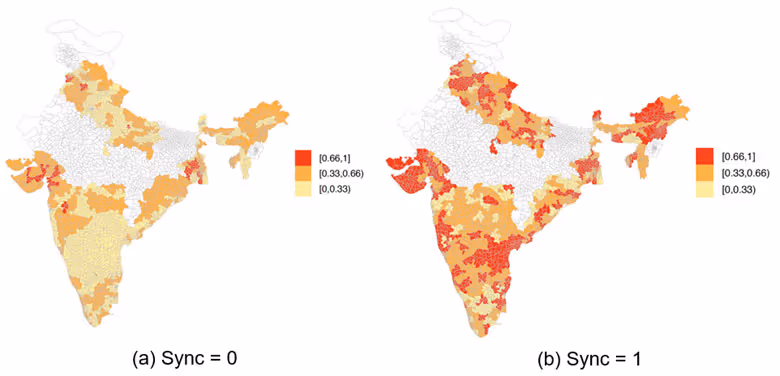 दो नक्शों (आकृति 1) की तुलना से यह स्पष्ट होता है कि चुनावों के एक साथ होने पर दोनों स्तरों पर निर्वाचन क्षेत्रों में एक ही पार्टी के जीतने की संभावना काफी बढ़ जाती है। दांए पैनल में लाल रंग से दर्शाए गए निर्वाचन क्षेत्र काफी अधिक हैं जो यह दर्शाता है कि जब चुनाव एक साथ कराए जाते हैं तो अधिक निर्वाचन क्षेत्रों के लिए संभावना [0.66, 1] के उच्चतम बैंड में होती है। इसके अलावा वृद्धि पूरे देश में एक-समान है, अर्थात्, प्रभाव किसी भी विशिष्ट क्षेत्र द्वारा चालित नहीं है।