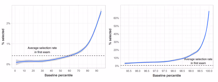 आकृति 2. उम्मीदवारों का प्रारंभिक स्कोर और नीचे के 95% (बाएं) और शीर्ष 5% (दाएं) के लिए चयन की संभावना