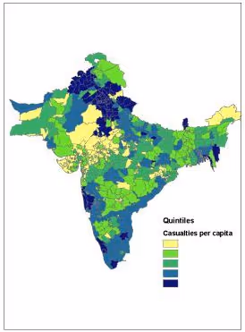 As we can see, the traditional ‘martial class’ regions such as Punjab and North West Frontier Province (NWFP) that provided the bulk of the colonial army had very high exposure to combat and a high numbers of casualties. But we can also see that even within these regions there was a lot of variation, and also that many other regions of the country, such as the former provinces of United Provinces, Bombay and Madras, had at least some districts where soldiers spent many months in combat or had a lot of casualties.