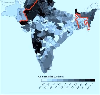 In a forthcoming paper, my co-author Saumitra Jha and I try out a new method that we argue can allow us to assess the effects of combat exposure in both subsequent conflicts and in peacetime. We take advantage of the fact that many armies, even if they don’t recruit randomly, do tend to deploy troops interchangeably once they’ve been recruited, assigning some units to lots of combat, while giving others a more relaxing time of it. These differences may emerge out of local military needs – troops just happen to be in the right place at the right time – or due to enemy action, such as the diversion of Indian troops in World War II from deployment to fight in the long campaign against Rommel in Africa to instead fight in the short and unsuccessful defense of Singapore.