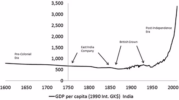 The year 1600 was during the end of Akbar’s reign, which is considered to be a prosperous time in India. Starting from that period, there was a continuous decline in India’s per capita income till around 1850. This decline started well before the advent of the East India Company and therefore its origin cannot be explained as an outcome of colonial policies alone. However it is also true that the East India company failed to arrest this trend and as a result, the average income declined by 17% under their reign (1757-1857).