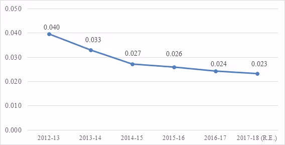The Right of Children to Free and Compulsory Education Act (RTE), 2009, aims to ensure free access to education for all children in the 6-14 age group, within a framework of collaboration between the Centre and state governments, piloted largely through the Sarva Shiksha Abhiyan1 (SSA). India’s low public expenditure on education in proportion to its GDP (gross domestic product), hovering at around 3% per annum over the last decade, has been well documented in the policy literature (Centre for Budget and Governance Accountability (CBGA) and United Nations Children's Fund (UNICEF), 2011). Within the total education budget, expenditure on SSA stands at less than 1% of GDP. Figure 1 shows a gradual decline in the expenditure on SSA, as a % of GDP, from 0.24% in 2012-13 to 0.14% in 2017-18 (revised estimates or R.E.2).