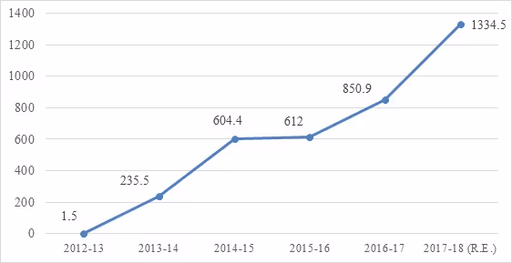 Government expenditure on research and development (R&D), which is vital for developing the innovative capacity of a country, has risen over time to appreciable levels – from Rs. 1.5 million in 2012-13 to Rs. 1.33 billion in 2017-18 (R.E.). Major schemes in R&D include ‘Training and Research in Frontier Areas’, ‘National Initiative for Design Innovation’ and the ‘National Initiative for Technology Transfer’ or ‘Startup India’, as it is known since 2016-17.