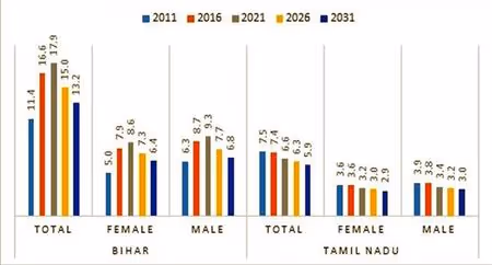 In Bihar, the TFR is far from reaching replacement level, and the population pyramid has a broad base in the child age group which will move upwards. By 2021, the higher education age group of 18-23 years – will increase by 57% from 11.4 million to 17.9 million. In contrast, Tamil Nadu, which has already passed the fertility transition phase, has much broader distribution in the middle: its population in the higher education group will decline from 7.5 million in 2011 to 5.9 million in 2031. A detailed look at the population projections across states reveals that in 2016, the Hindi belt states namely, Bihar, UP, Jharkhand, Rajasthan, and Madhya Pradesh, have the maximum proportion of their population in the 18-23 years age group. Punjab, Haryana and the southern states like Kerala, Tamil Nadu, and Karnataka, have the least proportion of their population (10-11%) in the 18-23 years age group.